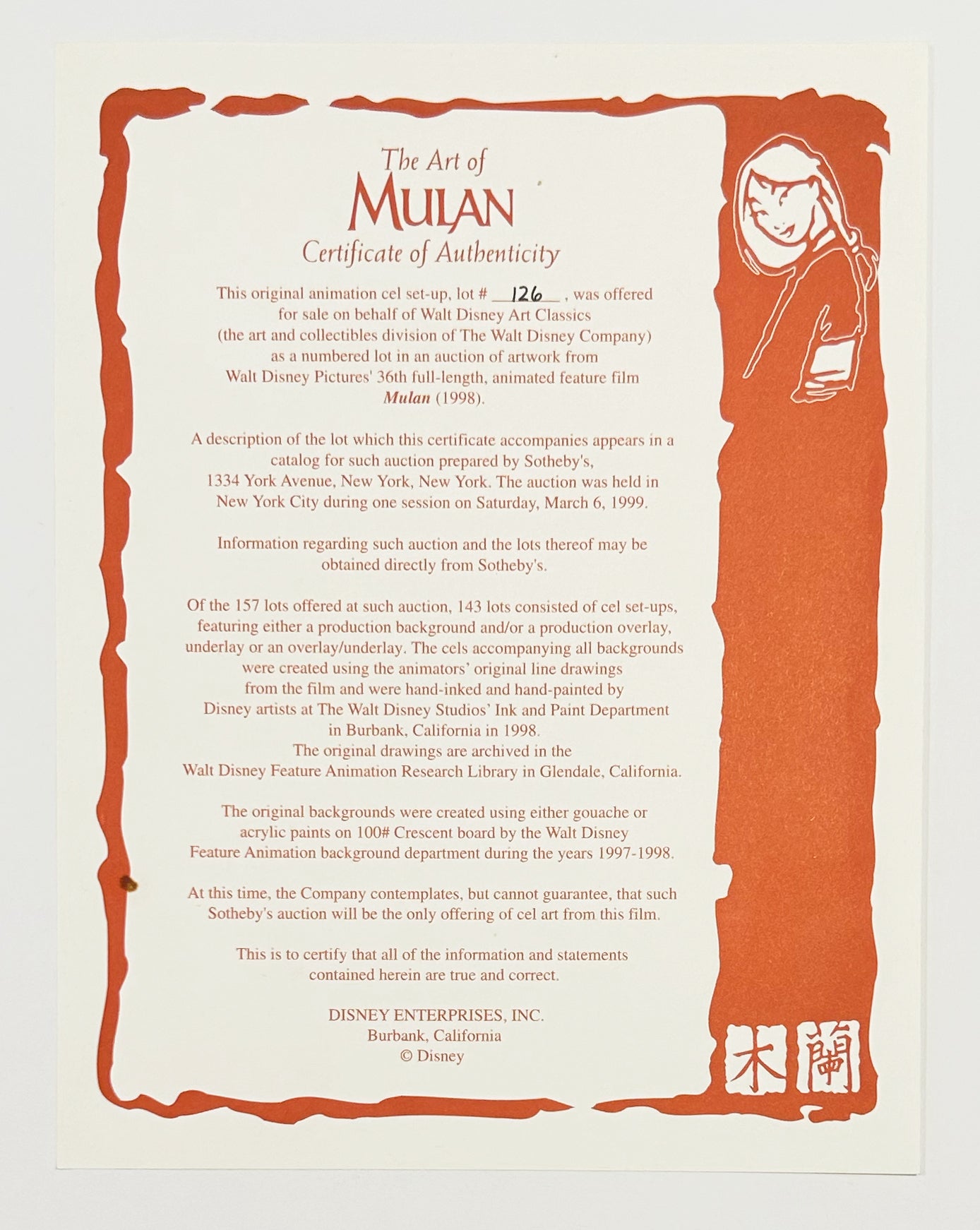 Additional Details: Four Cel Set-up, three of which are production underlays, from Mulan. Originally sold in Sotheby's "The Art of Mulan" Auction, Lot 126